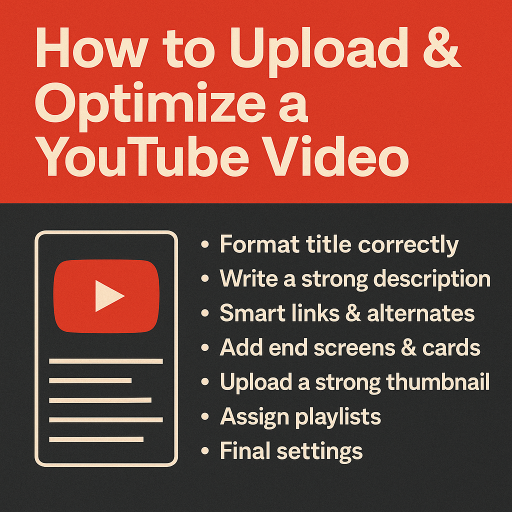 Turn every upload into a growth tool. Learn how to format titles, write descriptions, add smart links, and optimize videos for YouTube’s algorithm.